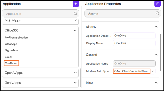 - In the Select an Application list, select the configured Office 365 application, OneDrive.