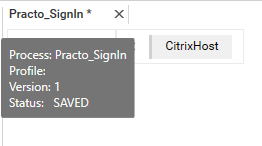 Canvas acts as the custom workflow designer area where Digital Worker sequences are created. The center of the screen is the canvas where each tab displays name of the process that you open. You can hover over the process tab to view the details like name of the process, its status and current version. Additionally, the navigation trail of the selected process is displayed.