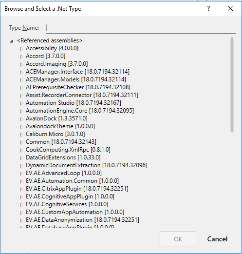 Automation Studio supports .Net variable type apart from default variable or argument types such as System.Data.DataRowView. You can browse for the .Net variable type using Browse for Types... option available in the Variable panel or the Argument panel.
