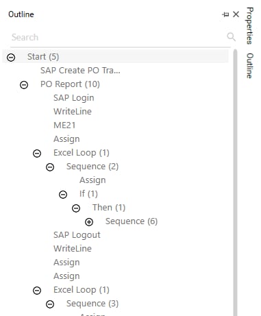 When you add an activity, details like the name of the activity, its properties, and the outline view of the selected activity appears.