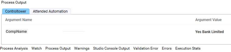 The console where you can view the parameters and the associated values marked for display in the Control Tower or Attended Automation. If you want to view the data visible in the Control Tower/Attended Automation you can test run the required process in Automation Studio and view the data in the Process Output console.