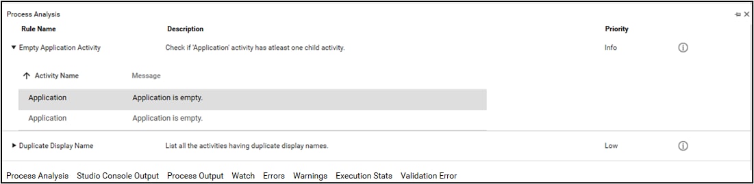 Click Analyse in the Tool Bar menu to generate and view the analysis result in the Process Analysis tab. It displays the name of the rule, the related rule description and the priority of the rule that might occur. You can expand the rule and see the activities that violate the rules. Double click the activity to navigate to the corresponding activity in the Flowchart designer area.