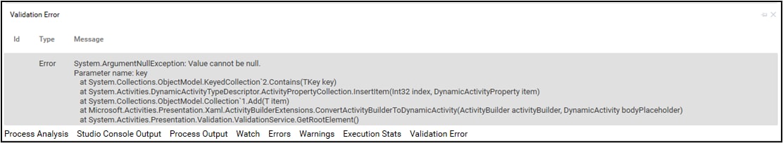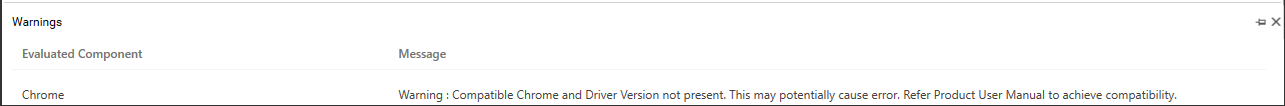 The console where you can view details about unexpected behavior of the process, if any. Warning provides a message related to possible future issue. These warning messages are shown for the applications which use any of the components covered by prerequisite checker even if the application has been imported or recorded by the PbE.