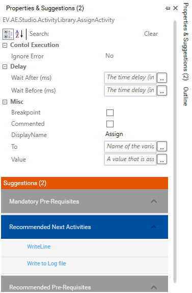 In the Suggestions pane, the list of prerequisites and next best activities associated with the selected activity is available. The Suggestions pane is divided in 3 sections: