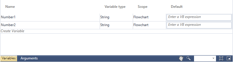 Variables and arguments are defined in the Parameter bar of the Automation Studio menu. You can even re-size the Flowchart designer using this bar.