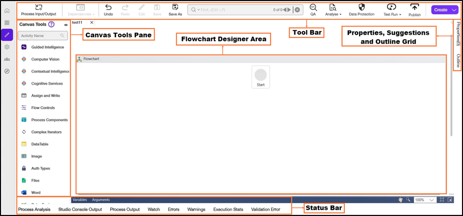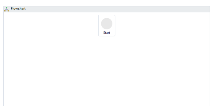 The Flowchart designer is the area on the Canvas where you can add activities to build workflow of the automation process. It appears when you start creating a process.