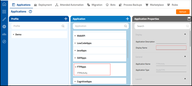 - Double click the Application activity, drag the FTP Activity and drop inside the Application activity.
