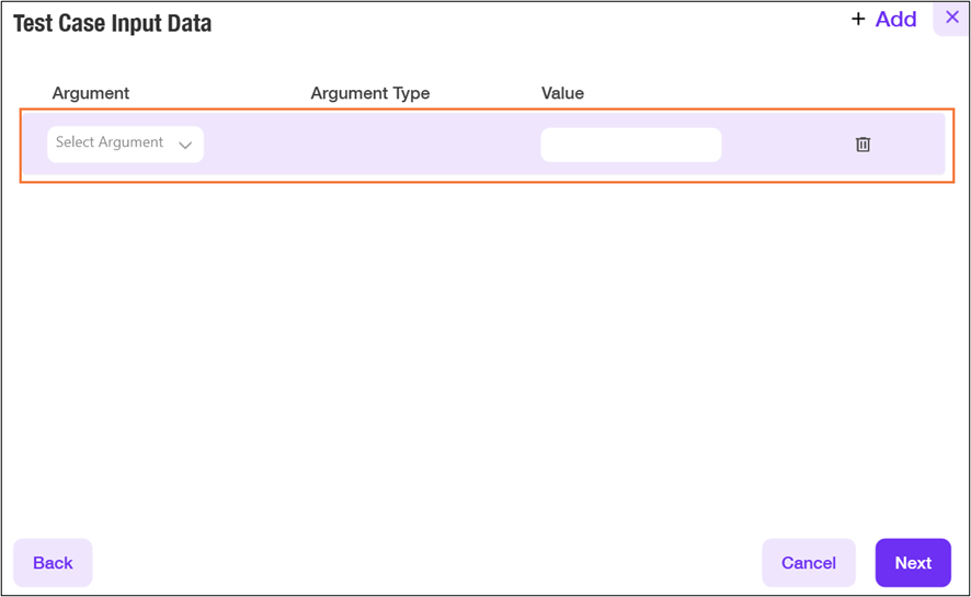 - If you have added any row for Test Case Input argument, then selecting the argument and providing the test data in the Value field is a mandatory step.