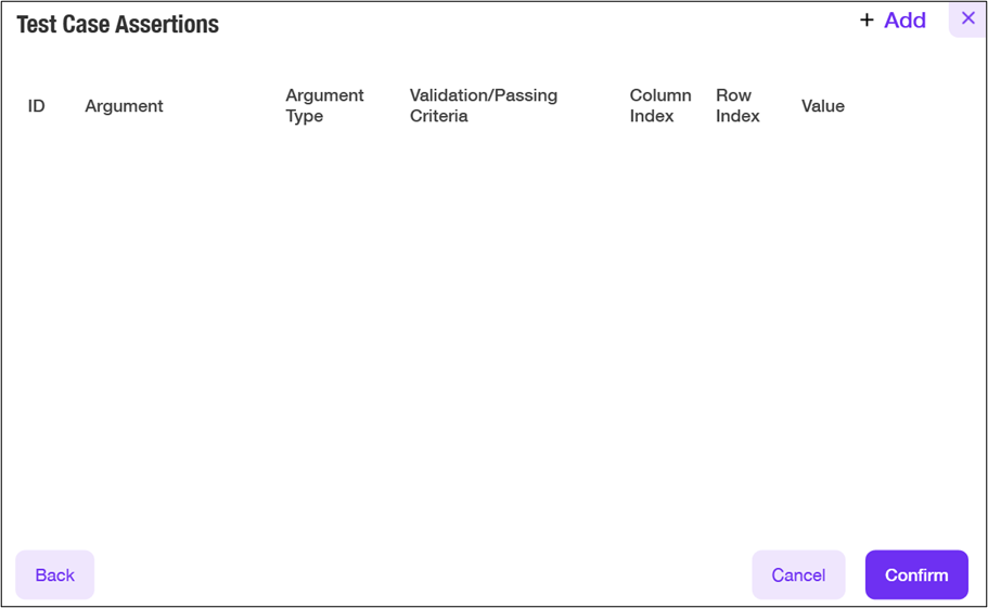 For every added test case output argument, selecting the Argument, asserting Validation/Passing Criteria, entering the test data value in Value field are mandatory steps. The Column Index and Row Index field values becomes mandatory and depends upon the selected assertion for the DataTable argument type.