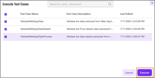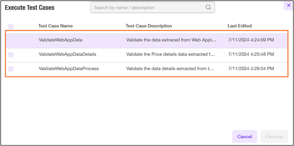 - Check the desired test case names that needs to be executed and click Execute. You can check one or multiple test cases for execution.