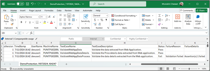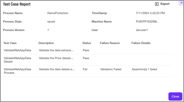 The execution report displays the status of execution for all test cases. If any assertion fails within the test case, then the test case also fails. In case you close the window while the test cases are getting executed, then the status is shown only for the test cases for which the execution got completed, for other test cases status is shown as aborted.