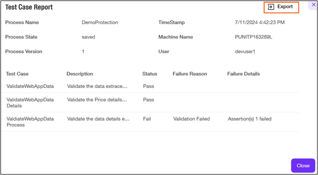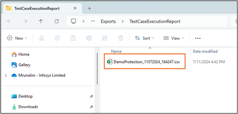 - Click Export to save the test case report. It exports the csv file at the folder location of %localappdata%\EdgeVerve\AutomationStudio_XXXXXXXXXXXXXXXX\Exports\TestCaseExecutionReport. The csv file is saved in the ProcessName_DDMMYYYY_HHMMSS.csv format.