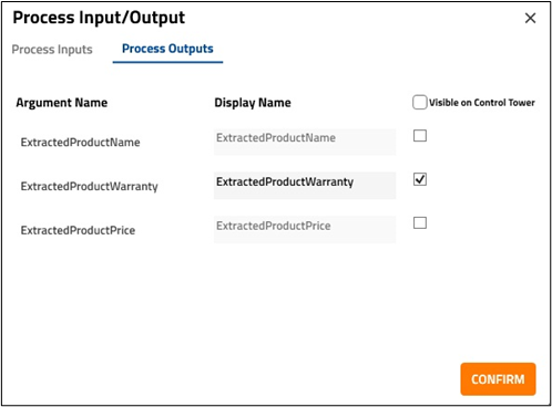 Select the Visible on Control Tower checkbox and then click CONFIRM to save the configuration. By default, all the parameters holding the process output are selected to be able to view in the Control Tower. Once the process workflow is Published and Deployed, the marked parameters are visible in the Control Tower. You can view the marked parameters in the Process Output console on performing the test run in Automation Studio.