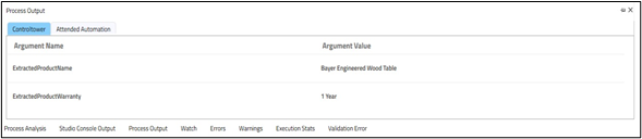It is defined as the capability that allows you to view the parameters holding the output values of the process workflow such as the web application extracted values, data extracted from the Excel application, and so on. The parameters are displayed in the Search Output of Control Tower based on your parameter selected.