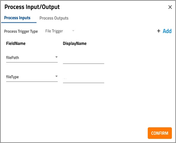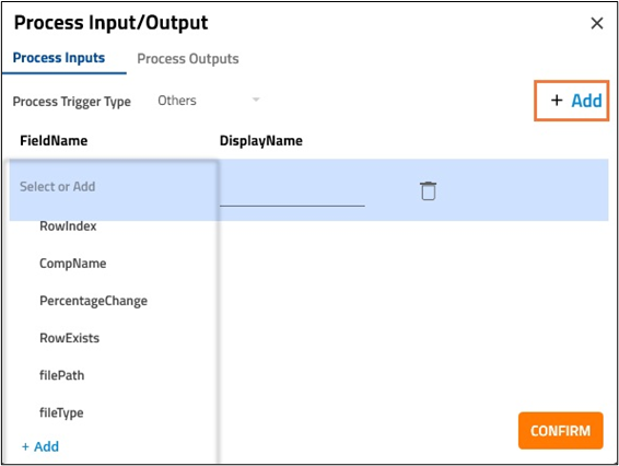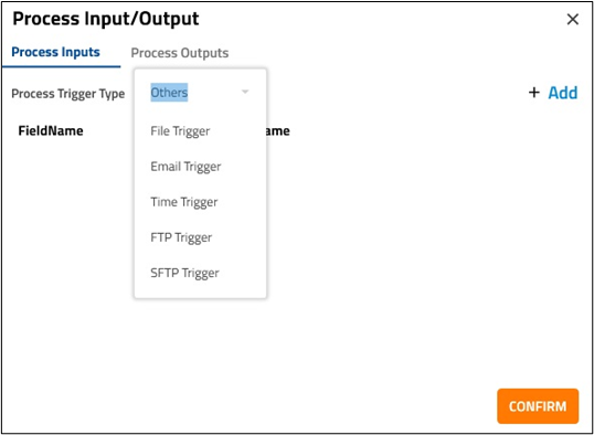 - Click Add and then click CONFIRM to create the process input related to the selected Process Trigger Type. Click following link to see the details related to the types of trigger parameters that can be set as process input: