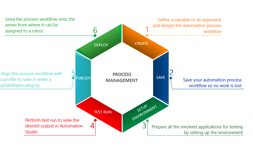 What is Process Management?Process Management lets you design, implement, and manage the business goals by automating repetitive and time-consuming processes and to streamline operations involving multiple business and IT environments. You can create different types of processes using multiple out-of-the-box adapters and activities, that is fast and easy to implement. Automation Process WorkflowAn automation process workflow in Automation Studio can be designed in the Flowchart designer of the Canvas area, based on your business need. It provides you a canvas to create process workflow of the task you want to automate. You can create a flowchart,add sequences, add activities and manage exceptions. An automation process workflow once created and published can be re-used that increases the productivity and accuracy of your work. It also helps you to reduce the human effort required for completing the task. Additionally, any data input used in Automation Studio that is a Personally Identifiable Information (PII) or is confidential, can be protected and masked using the Data Protection feature. Automation Process LifecycleThe life cycle of an automation process workflow in Digital Worker/Engage is designed considering key elements of SDLC (Software Development Life Cycle). It can be divided into Process Design and Process Execution. Designing of automation processes is done using Automation Studio while the process execution happens with the help of robots that can be created in the Control Tower. The high level automation process life cycle incudes: Process DesigningCreate different types of processes using multiple out-of-the-box adapters and activities that are faster and easier to implement. Click the respective boxes in the below diagram to learn more about each stage of process designing.