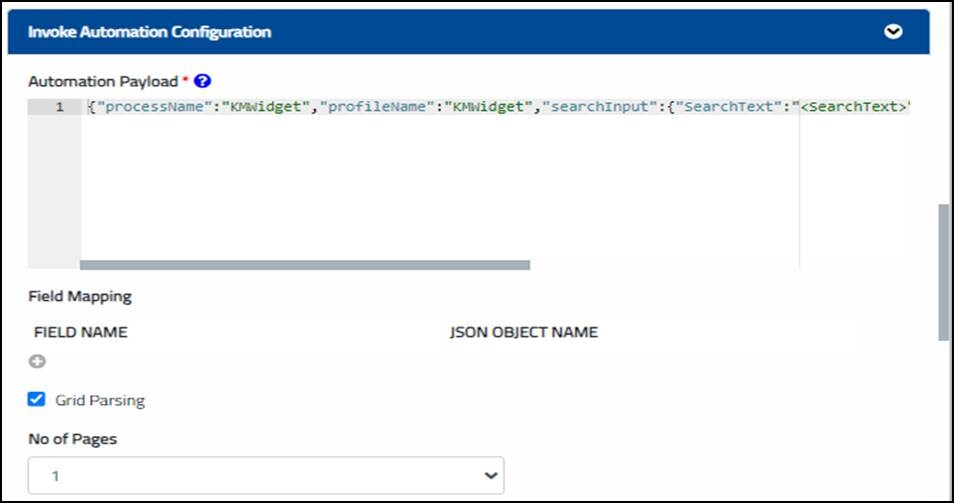 - Add the process binder in the Automation Payload field. {"processName":"KMWidget","profileName":"KMWidget","searchInput":{"SearchText":"<SearchText>","File":"<FileType>","index":"0","size":"1000","lastModified":"<ModifiedOn>"}}.