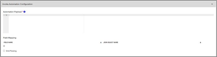 - In the Automation Payload field, add the process binder {"processName":"<Process Name from Automation Studio> ","profileName":"<Profile Name Mapped to>","searchInput":{"<Input":"<InputID>"}}.
