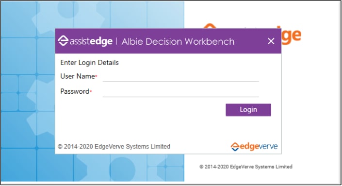 Login Into Albie Decision MakingUsers with role having Albie_Decision Workbench access can launch the Albie Decision Workbench application. The Albie_Decision Workbench access can be enabled by Administrators if the valid licenses are available for Albie Decision Workbench application.
