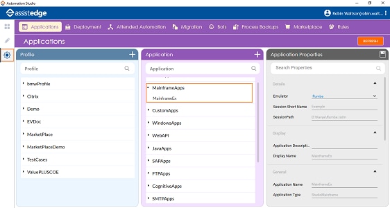 2. In the Applications Properties panel: · Select the required emulator in the Emulator list. · Enter the short name of the session as set in the selected emulator in the Session Short Name field. This field appears only if Emulator selected is Rumba or EHLLAPI. · Enter the path of the session file in the SessionPath field, that contains all the necessary details required to connect to the mainframe terminal. · In the Display Name field, enter a desired name of the Mainframe application. 3. Click