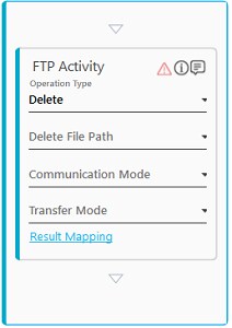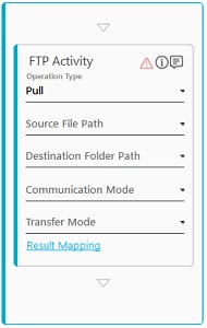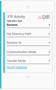 Using FTP ActivityThe FTP Activity supports following operations: · Push- uploades the file in the FTP or SFTP site. · Pull- downloads the file from the FTP or SFTP site. · List Directory- lists all the files and folders available at the FTP or SFTP site location in an excel file. · Delete- deletes the files from the the FTP or SFTP site. · Rename- renames the files present in the FTP or SFTP site