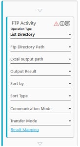 5. In the Ftp Directory Path list, select the parameter containing the FTP or SFTP directory path from where you want to list the files. , for example- "\FTP\". You must pre-define the parameter with the directory path to make it appear for the selection. 6. In the Excel output path list, select the parameter containing the path of the excel file (along with the file name, for example- "D:\DataTransfer\ExcelOutput.xlsx"). You must define the parameter in the Parameter bar to let it appear for the selection. 7. In the Output Result list, select the parameter where the output of the sorted file list is saved. 8. In the Sort by list, select the criteria based on which you want to sort the files. Available options are- Name, DateModified, Size and Type. 9. In the Sort Type list, select the order by which you to apply the sorting criteria. Available options are- ASC and DESC. ASC signifies ascending order while DESC signifies descending order. 10. In the Communication Mode list, select Active or Passive depending on how the data connection is established between the client and the server. 11. In the Transfer Mode list, select Binary or ASCII (Text) depending on the content of the file to be transferred. You can not transfer images file type using ASCII (Text) mode. 12. Click Result Mapping link, Output Mapping list appears. Select the available parameter to map the status of the operation performed. Both Boolean and String type is supported. You must define the parameter in the Parameter bar to let it appear for the selection. If the operation is successful, it returns true and if the operations fails it returns false. It can be used as an input for the next action that you want to perform depending upon the success or failure of the operation.
