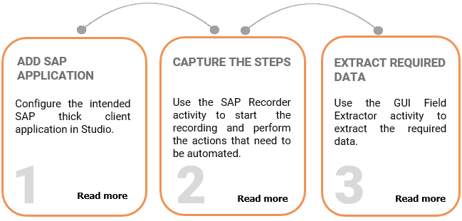 Prerequisites· An active enterprise SAP connection. · Save the assembly files in the Automation Studio folder available on your system. · Automate the process of signing to a SAP application using the Mutimodal Interface. See the Web Mode section to know how to configure the steps. Alternatively, create a Sign-In Process for the intended SAP application and use the SignIn Process activity to automate sign in steps. See Using SignIn Process sections to know how to automate signing in to an application. SAP Thick Client Automation JourneyThe below diagram gives an overview of a typical journey involved in creating a SAP thick client automation process workflow: