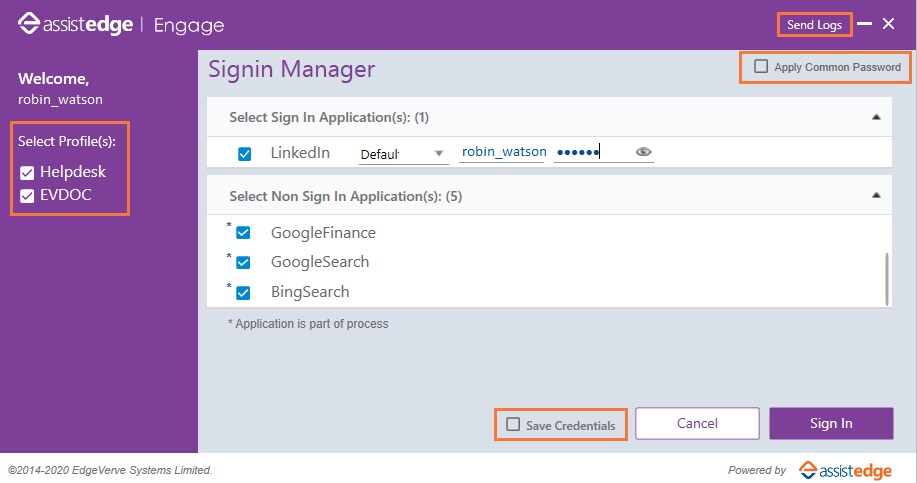 Click Send Logs on the upper-right, if there is an error during sign in. The system composes an email with the logs as an attachment and Engage application screenshot as an email body. Send it to the system administrator or the support team. |