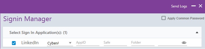- Select Apply Common Password on the top-right if you have the single password for all the applications. You need not type the password for each application separately. This is applicable only for default type. For CyberArk, you need to enter the parameters.