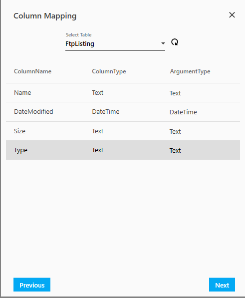 - Click Next. The Column Mapping details appear. The details such as the column name, column type and argument type, related to the table that stores the filtered file names are displayed.