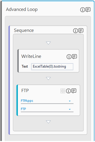 - Double click the Advanced Loop activity, and drop the WriteLine activity to convert the data received in the Output table of above loop, into a string. This string stores the result of the Advanced Loop operation that is the filtered file name and perform the FTP action every time the required file name is encountered in this loop.