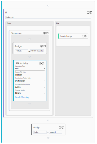 - Drop Assign activity. Assign the value of the FTP directory and the filename filtered from the previous loop such as, "\"+ExcelTable.tostring to the FTPath argument.