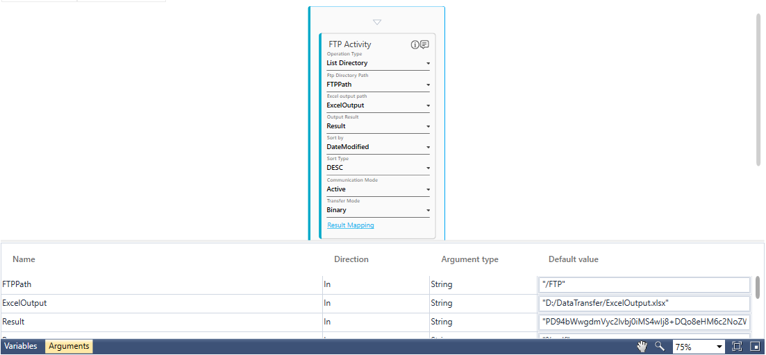 - In the Result argument, the output result of the FTP operations is saved. The results is stored during the runtime only, it is not available once the process execution completes.