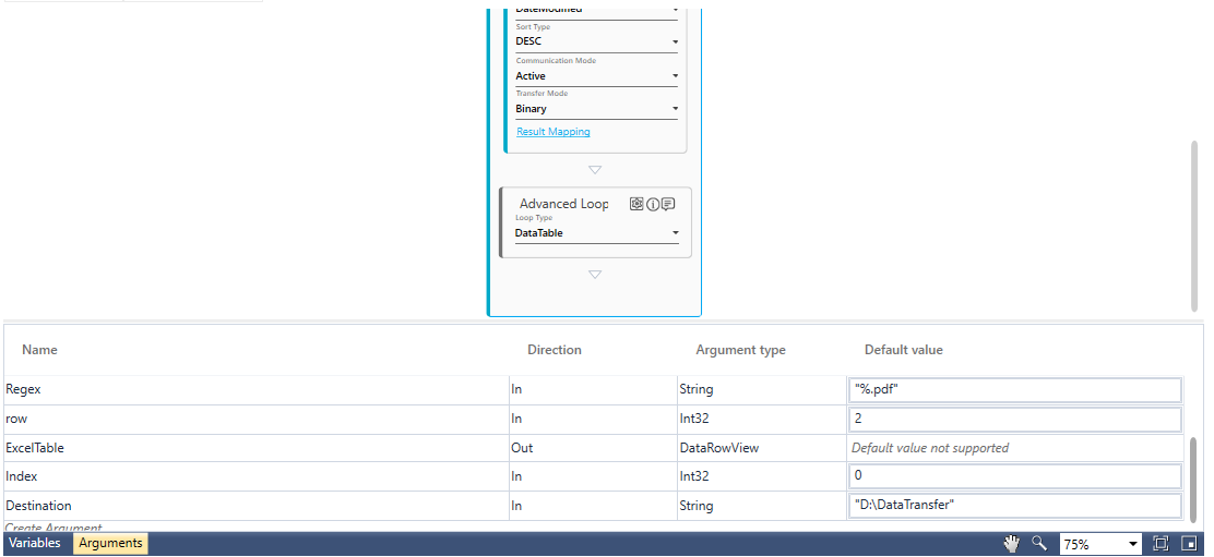 - In the Parameter bar, create in arguments, FTPPath, ExcelOutput, and Result for the first FTP Activity that fetches the list of directory files.