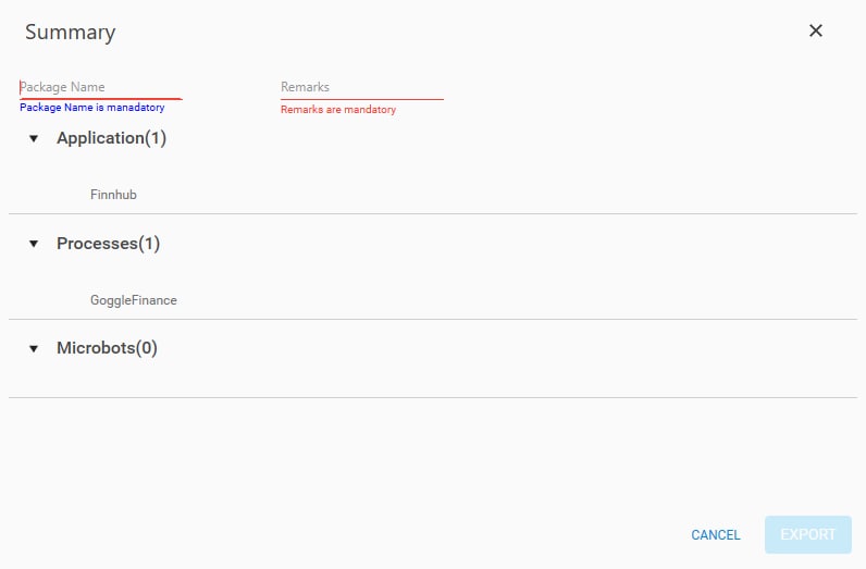 - Select one or more process, and then click EXPORT. The Summary dialog box appears displaying the information such as total number and name of the processes, application and microbots to be exported.