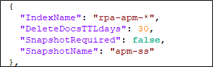 Navigate to $\app\Vanguard\appsettings.json location and open the file. In ESIndexDataDeletionSettings section > “IndexName”: “rpa-apm-*”, update the value for “DeleteDocsTTLdays” to number of days you want to keep APM data in TxnStore index.