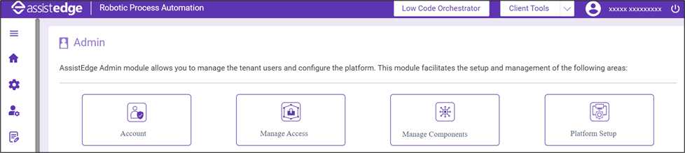 - Navigate to AssistEdge Admin screen. For more information, see Administrator Guide.