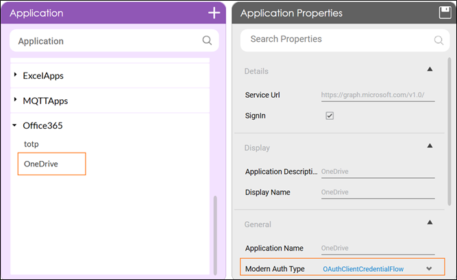 - In the Select an Application list, select the configured Office 365 application, OneDrive.