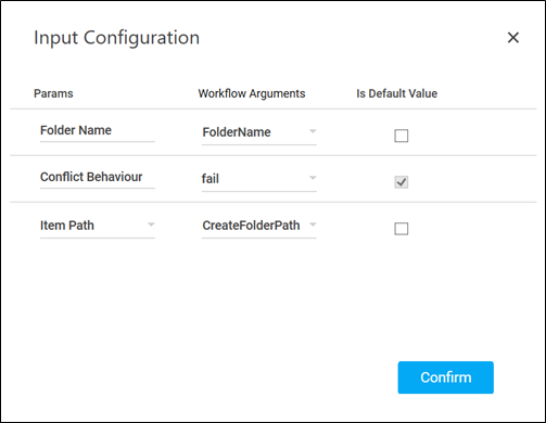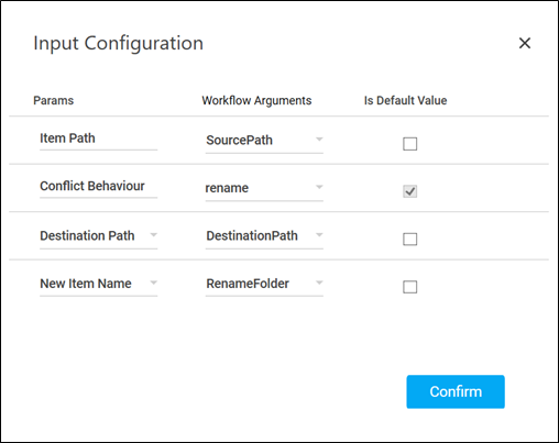 - Corresponding to the New Item Name parameter, select RenameFolder argument in the Workflow Arguments list to pass the name of the folder that must be used to rename the required folder if a duplicate folder is encountered at the specified location.