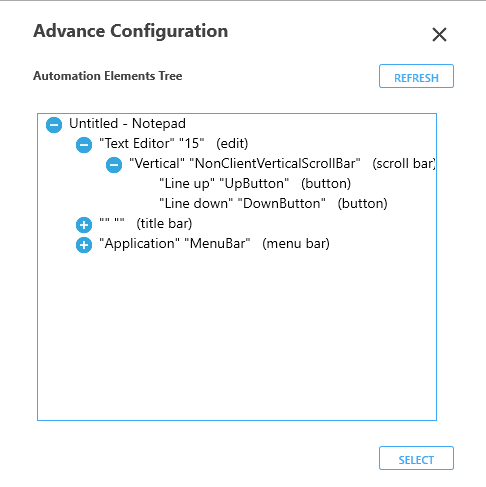 - Advance Configuration- Allows to configure the UI elements of the windows application in a hierarchical manner available within an element tree. You can select the intended UI element to open the Field Properties pane without performing the subsequent action.