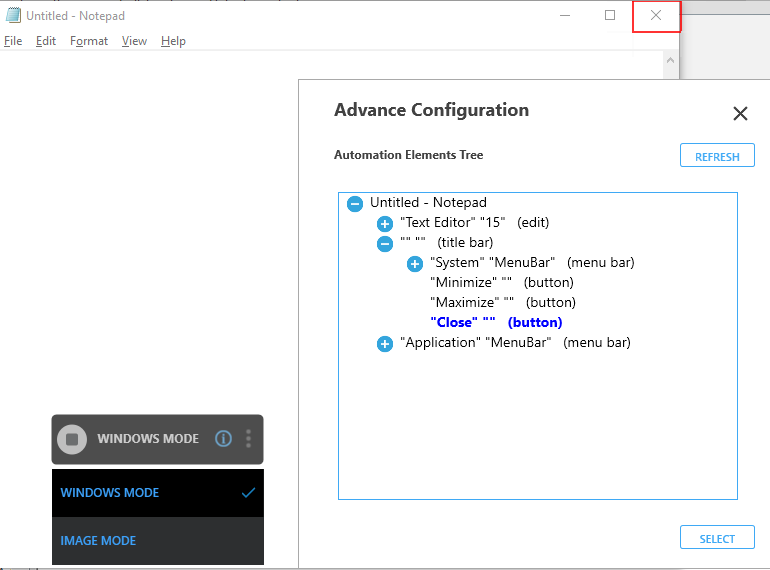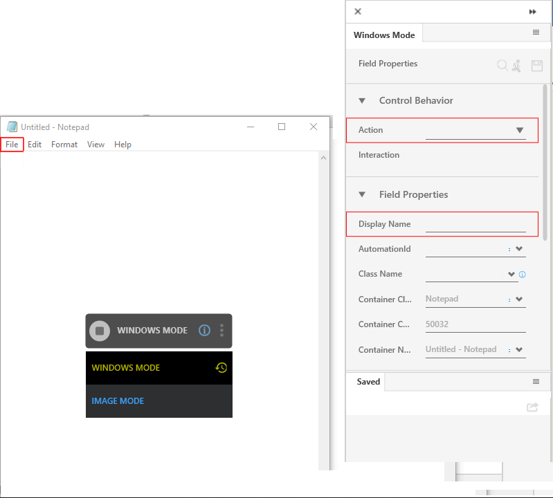 Unlike automation of web application, while configuring UI elements of the windows application, systems highlights the intended area and performs the subsequent action rather than just capturing the step of automation process workflow. For example, if you want to capture the X (Close) button of the windows application to automate closing of the application, the system closes the application when you click the area on the UI even before launching the Field Properties pane. To help avoid such scenarios, Windows Mode configuration lets you configure the UI elements in two different ways: