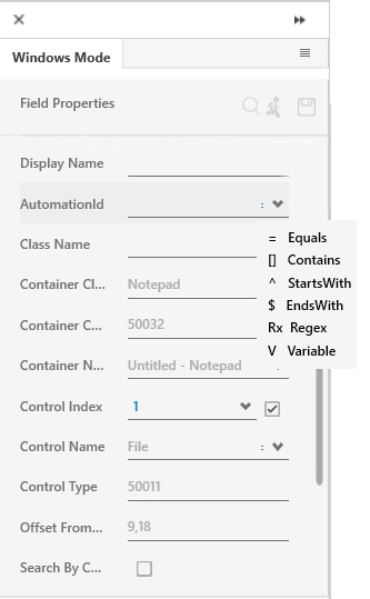 - StartsWith- Identifies the UI element based on the starting string of the value of the selected field property.