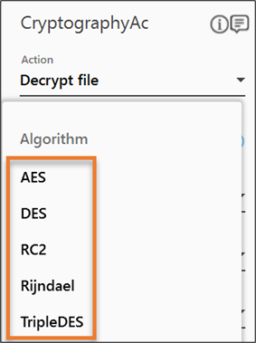 - From the Key dropdown list, select the same key value you selected at the time of encrypting the file. The selected argument must be of the String type. Refer the key length specifications of algorithms.