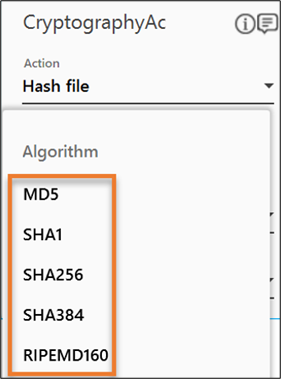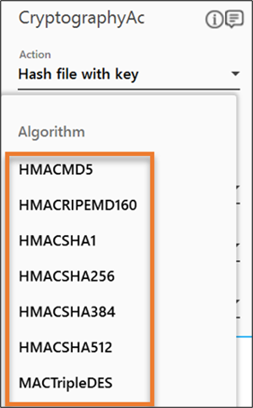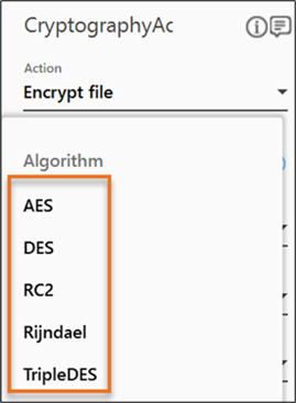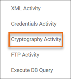 The Cryptography Activity enables you to encrypt or decrypt text or files with the help of specified algorithms, key, and encoding. This activity also enables the hashing of text or files.