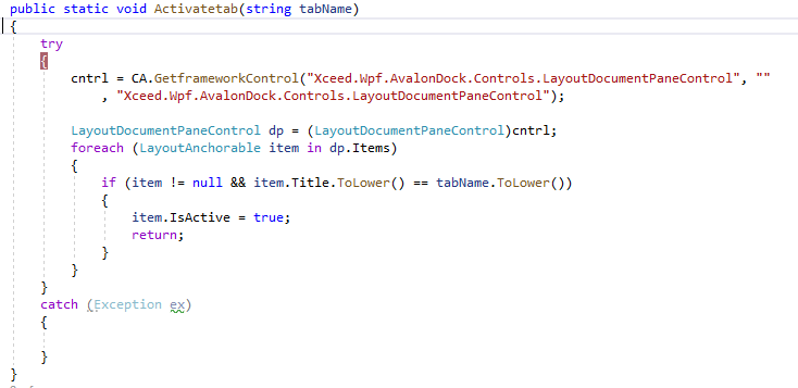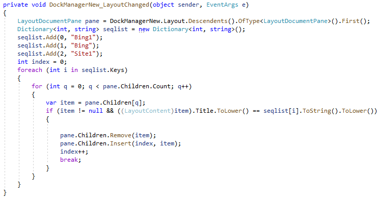 - At the time of Engage launch, the tabs can be sequenced in the DockManagerNew_LayoutChanged event handler as shown in the code sample below.