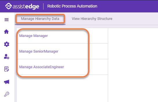 In the Manage Hierarchy Data tab, all the available entities are listed on the left panel. You can view, add, and manage hierarchy data in the system.