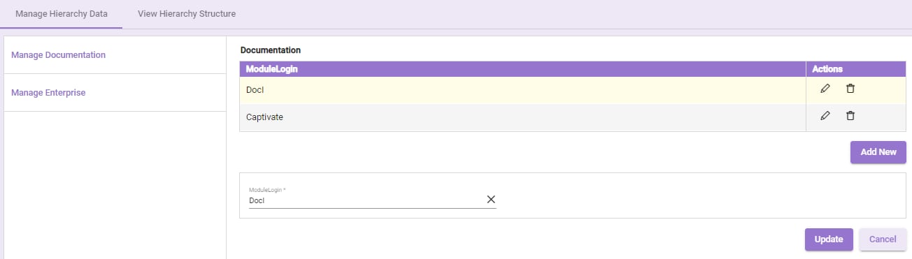System administrator can edit the hierarchy data. Each Hierarchy Data except the level 1 entity is associated with the hierarchy data of its parent entity. Every Hierarchy data row contains Edit and Delete links.