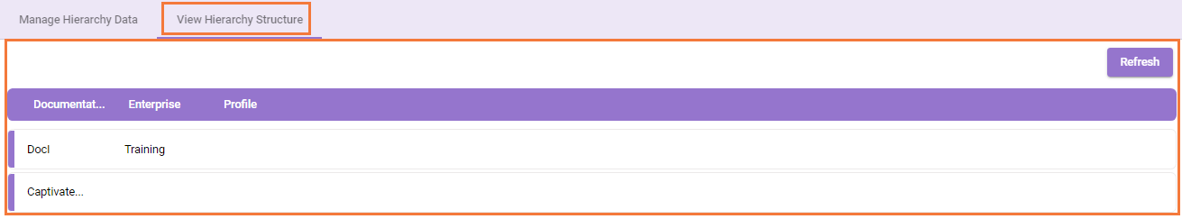 View Hierarchy Structure tab displays the entire structure of the entities and their corresponding data. Each column indicates the available entities in the system. The entities on the left side is level 1 and the entities on the right side (except Profile column) is the last level of an entity.