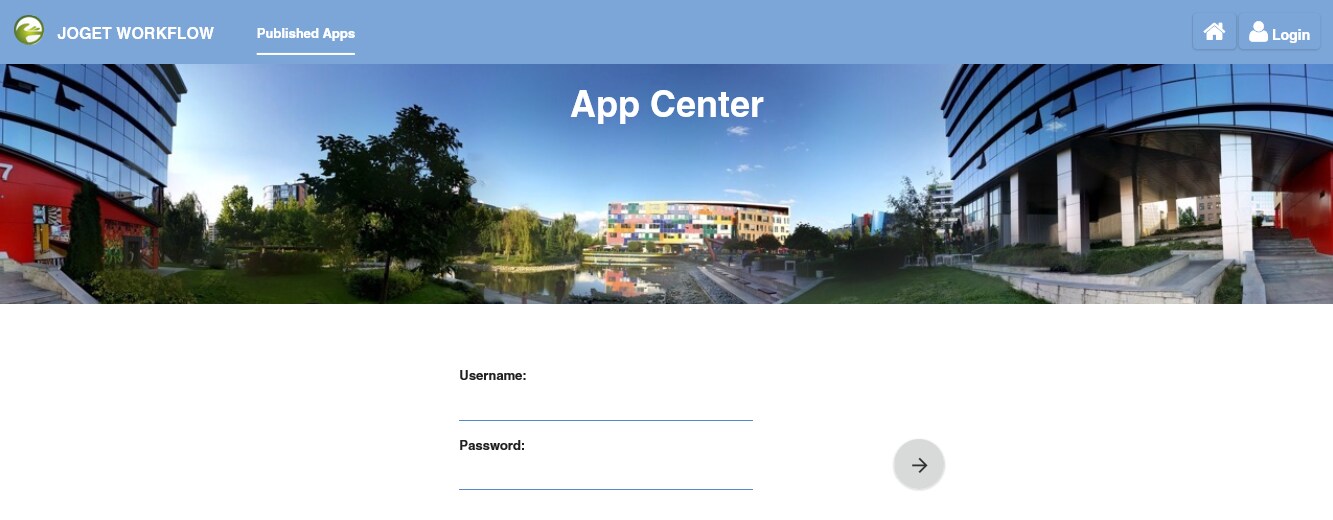 The App Center is the default landing page in Joget DX which displays a grid of published apps. To access the App Center, use a web browser to access the Joget server at http://localhost:8080/jw (Replace localhost and 8080 with the appropriate server host and port if necessary)