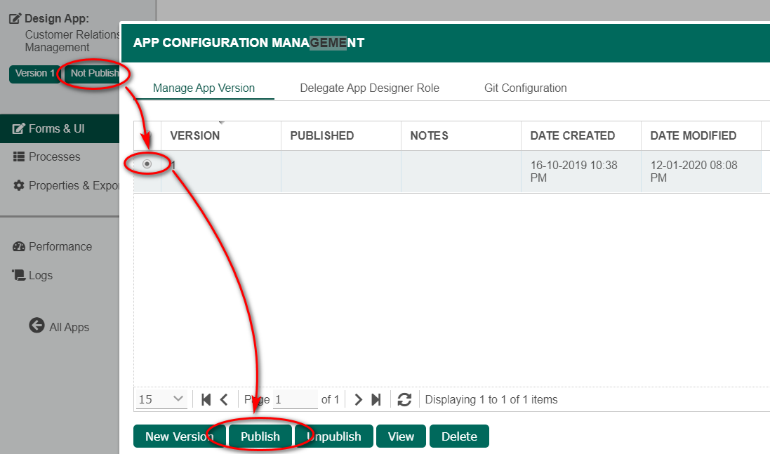 - App with Id "leaveSystem" with App Version 2 (Process Version 10) exists in the environment.